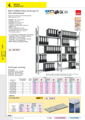 Anbauregal: 1 Rahmen, Fachböden Abb. zeigt einseitiges Büro-Steckregal ohne Abdeckboden, 1 Grundregal und 1 Anbauregal,
